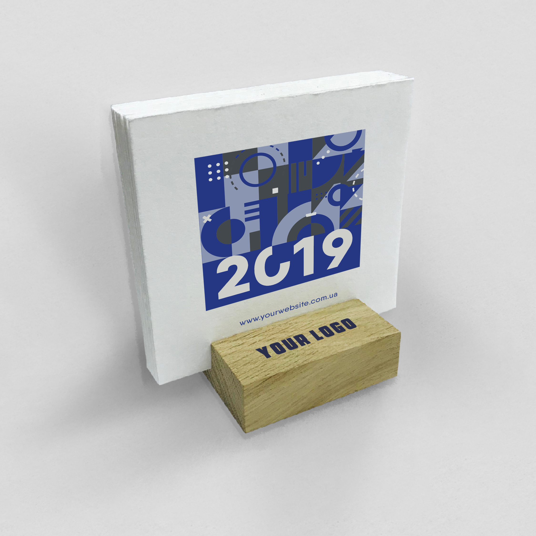 Настольный календарь  80х130мм., основа деревянная «финский дуб», нанесение полноцветного логотипа, 13 карточек печать на дизайнерском картоне 650г\м2.